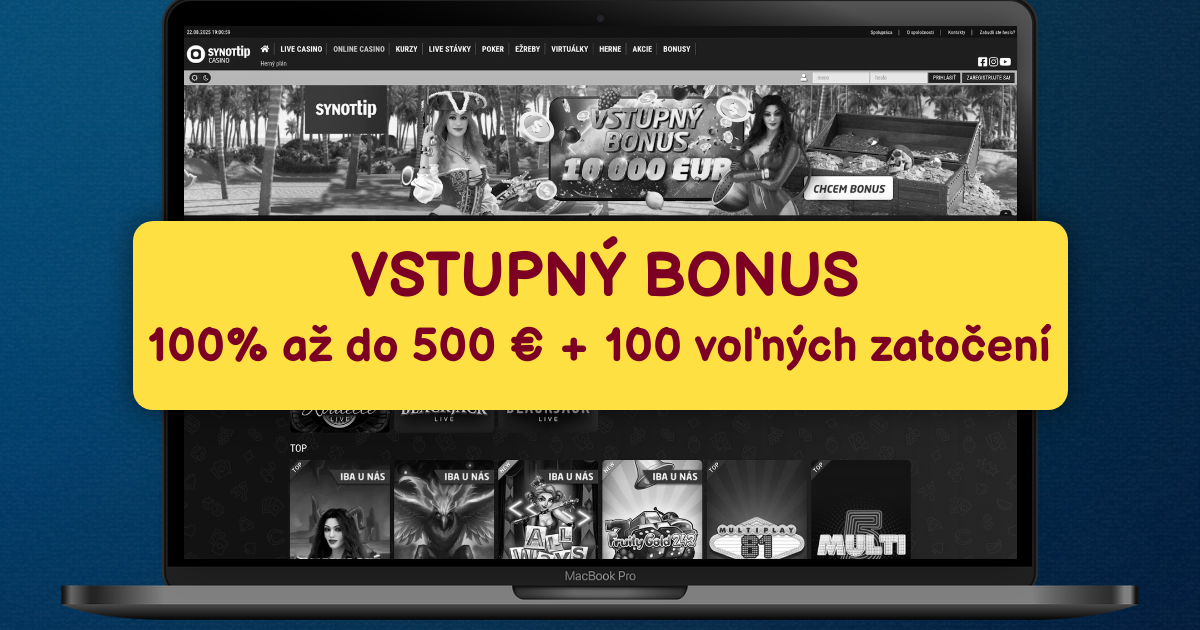 Vstupný bonus dosahuje 10 000 € a 640 free spinov rozdelených do 4 častí viazaných na 4 vklady. Promo kód sa zadáva pri vklade na webstránke a v aplikácii, nie pri SMS vklade. Kódy zahŕňajú bonus80, bonus200 až po bonus640 pri vkladoch od 100 €. Free spiny sa udeľujú na vybraných automatoch SYNOT Games, napríklad Book of Secrets, Respin Joker, Blazing Ice. Prevádzkovateľom je SYNOT TIP, a.s., licencované kasíno na Slovensku.